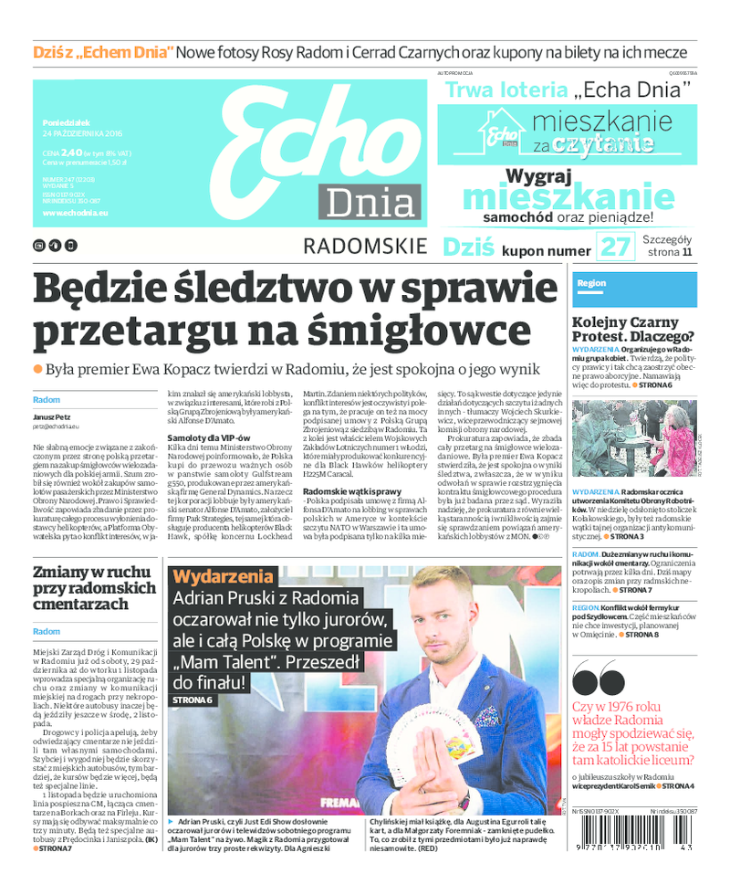 Echo Dnia to największy dziennik w swoim regionie. Dociera do mieszkańców Kielc i województwa świętokrzyskiego oraz dawnego województwa radomskiego i tarnobrzeskiego. Codziennie dostarczamy najświeższe i najważniejsze informacje. Razem z dziennikiem nasi czytelnicy otrzymują stałe i okazjonalne dodatki. W piątek ukazuje się najpoczytniejsze wydanie magazynowe wzbogacone dodatkiem telewizyjnym oraz lokalnymi tygodnikami.