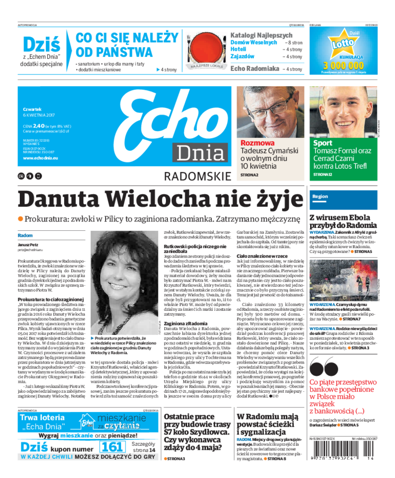 Echo Dnia to największy dziennik w swoim regionie. Dociera do mieszkańców Kielc i województwa świętokrzyskiego oraz dawnego województwa radomskiego i tarnobrzeskiego. Codziennie dostarczamy najświeższe i najważniejsze informacje. Razem z dziennikiem nasi czytelnicy otrzymują stałe i okazjonalne dodatki. W piątek ukazuje się najpoczytniejsze wydanie magazynowe wzbogacone dodatkiem telewizyjnym oraz lokalnymi tygodnikami.